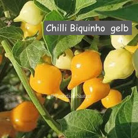 Aussehen: Kleine, glatte, zylindrische Früchte, ca. 3–5 cm lang. Reif von grün zu gelb; bei voller Reife oft leuchtend gelb bis goldgelb. Pflanze kompakt, seltener stark verzweigt. Geschmack: Milder bis fruchtiger Geschmack mit leichter Schärfe. Ideal, um Speisen sanft zu würzen, ohne dominant zu sein. Schärfegrad: Sehr mild bis mild (im Bereich ca. 0–1.000 Scoville-Einheiten je nach Reifegrad). Für Anfänger gut geeignet. Verwendung: Vielseitig in Salaten, Dipps, Sandwiches, Suppen, Saucen oder eingelegt. Hervorragend in Öl einlegen oder frisch in Gerichten verwenden, um eine fruchtige Note zu bekommen. Anbau: Anspruchslos für Balkon oder Garten. Bevorzugt sonnig bis halbschattig, ausreichend Wasser, gut durchlässiger Boden. Kürzere Reifezeit, oft mehrjährige Ernte möglich. Pflegehinweise: Regelmäßiges Gießen, dünne Triebe entfernen, regelmäßig düngen. Ernte, sobald die Früchte gelb leuchten und fest sind. Lagerung: Frisch im Kühlschrank 1–2 Wochen oder länger in Öl/Essig einlegen. Tiefkühlen möglich. Nährwert (ungefähr pro 100 g): Kalorien ca. 20–30 kcal, wenig Fett, moderate Kohlenhydrate, Ballaststoffe, Vitamin C und Provitamin A. Verwechslungshinweis: Gelbe Biquinho unterscheiden sich von schärferen Sorten durch deutlich geringere Capsaicin-Level; Nomen auch als "Yellow Biquinho" bekannt.