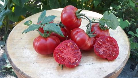 Frucht: Die Tomaten sind groß, flach und haben eine ausgeprägte, gerippte Oberfläche. Ihre Farbe