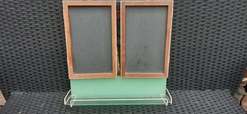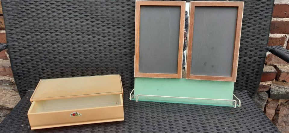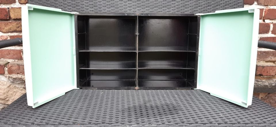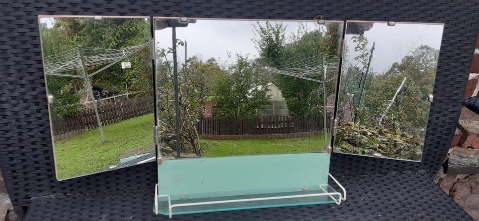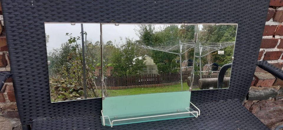 Ich gebe diese Badgarnitur aus einer Haushaltsauflösung ab. Man kann leider nicht alles aufheben. Die Garnitur besteht aus einem klappbarem Spiegel mit integrierter Ablage, einer kleinen Schublade (für Kämme) und einem Schränkchen mit verstellbaren Einlagen