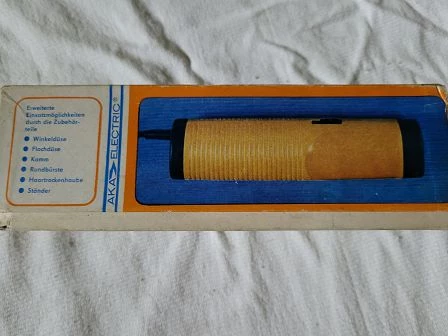 Frisiergerät LD 11 in der Farbe "Orange" in Originalverpackung AKA electric VEB Elektrowärme Altenburg Betrieb des Kombinates VEB Elektrogerätewerk Suhl Bedienungsanleitung, Garantie und Vertragswerkstätten Verzeichnis beiliegend EVP: 48 M