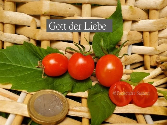 Symbolik: Der Ausdruck „Gott der Liebe“ verbindet oft Leidenschaft, Wärme und Zärtlichkeit mit der Tomate, die in vielen Kulturen als Symbol für Fruchtbarkeit, Leidenschaft und Freude gilt. Aussehen: Glatte, elastische Haut; weiches Fruchtfleisch; kleine Samen im Fruchtfleisch. Geschmack: Von süß bis leicht säuerlich, je nach Sorte und Reife. Verwendung: Vielseitig – roh in Salaten, als Snack, in Saucen, Suppen, Pesto oder gebacken.