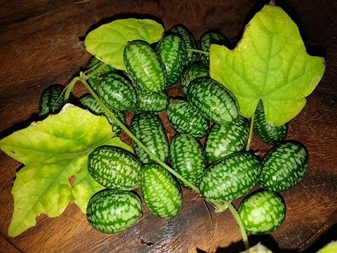 Die mexikanische Minigurke, auch bekannt als "Mexican sour gherkin" oder "Sour cucumber" (wissenschaftlicher Name: Melothria scabra), ist eine kleine, essbare Frucht, die zur Familie der Kürbisgewächse (Cucurbitaceae) gehört.
