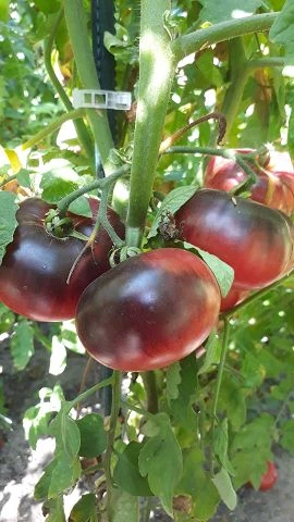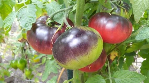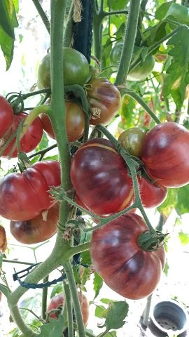Die Früchte haben festes Fruchtfleisch mit wenigen Samen und sind gut lagerfähig. Der Geschmack ist perfekt ausbalanciert und fruchtig. Von der Indigo Rose hat die Sorte somit nur die den schwarzen Anthofarbstoff geerbt. Die grünen Anteile reifen auf ein schönes dunkles Rosa ab. Wie Christbaumkugeln hängen die Tomaten an der Pflanze und leuchten aus dem Blattwerk hervor. Mlle Foriers ist eine echte Augenweide und eine der schönsten Sorten im Anbau 2022. Auch geschmacklich hat sie uns überzeugt.