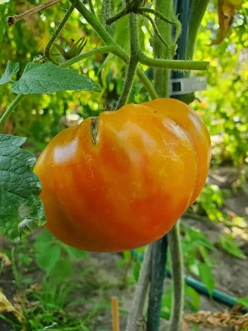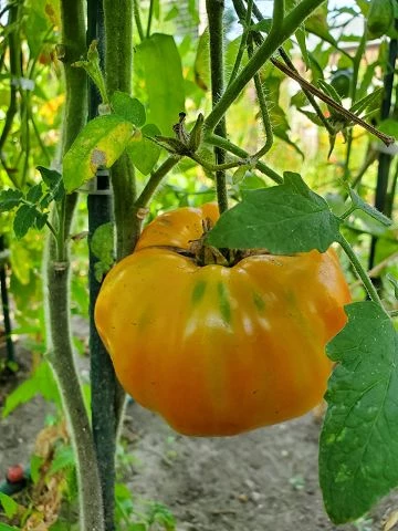Die Old German Tomate hat eine auffällige, gestreifte Haut, die in verschiedenen Farbtönen von gelb bis rot variiert. Die Früchte sind meist groß und haben eine leicht flachovale Form.
