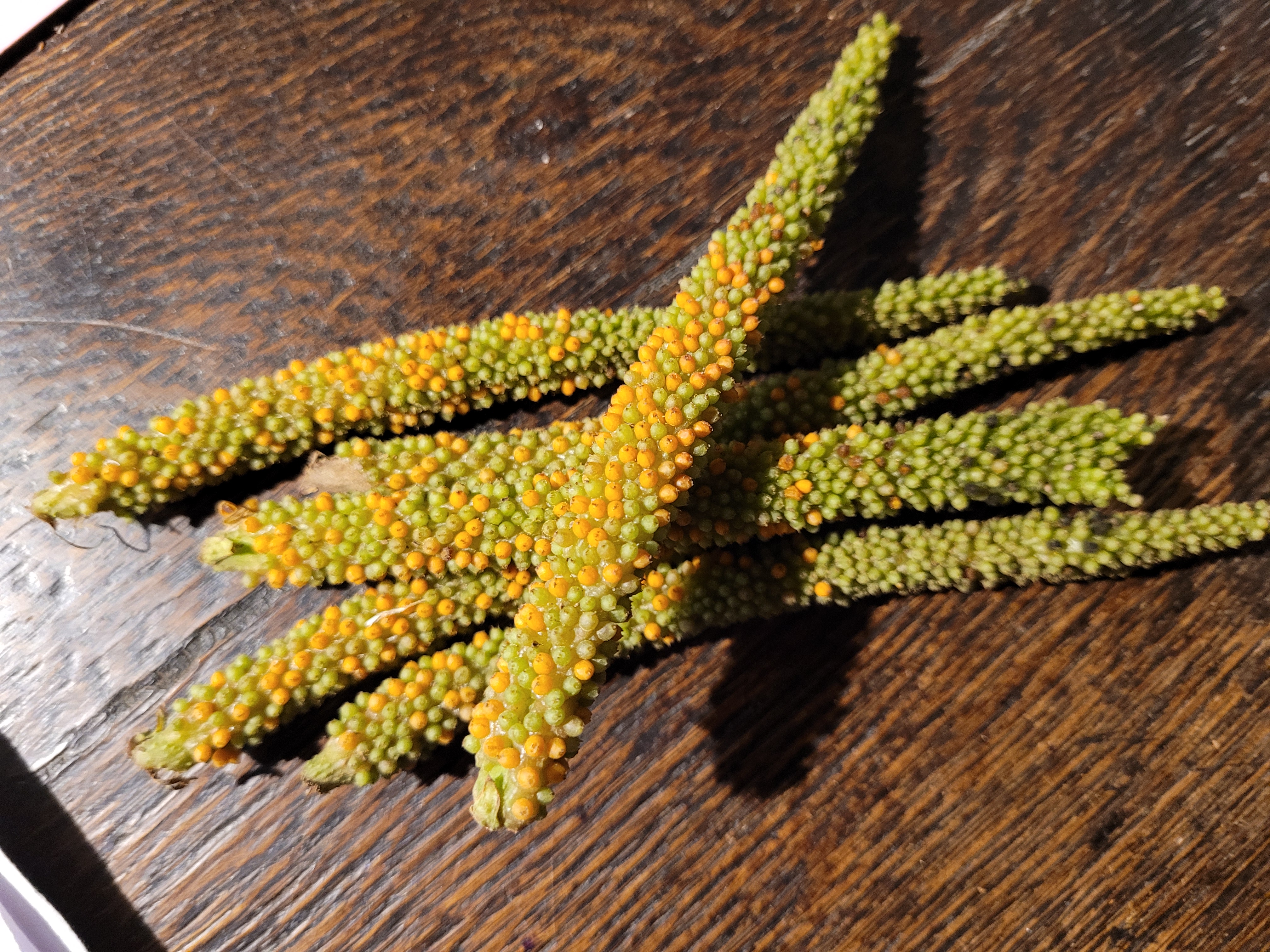 Die Blütezeit dauert von Juli bis August. Dann zeigt das Mammutblatt stolze 120 Zentimeter große, zunächst aufrecht stehende, später fast liegende rötliche Blütenkolben, die aus vielen unscheinbaren Einzelblüten bestehen. In ihrer Gesamtform sind sie kegelförmig (konisch) bis schmal eiförmig angeordnet.