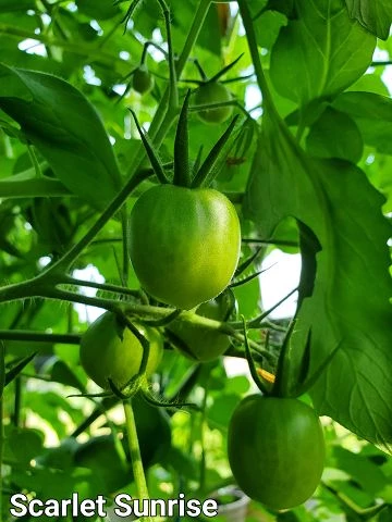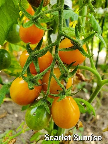 Die unbestimmten Pflanzen sind ertragreich, mit einer Fruchtreife in der Mitte der späten Saison. 'Scarlet Sunrise' ist offen bestäubt; 70 Tage bis zur Fälligkeit. Rote und gelbe rissresistente Früchte mit süßem, intensivem Geschmack. Ertragreiche, unbestimmte Pflanzen.