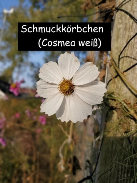 Das Schmuckkörbchen, auch bekannt als Cosmea oder Kosmee (Cosmos bipinnatus), ist eine beliebte Gartenpflanze, die für ihre zarten, gefiederten Blätter und die auffälligen Blüten geschätzt wird. Die weiße Variante der Cosmea ist besonders elegant und kann in vielen Gärten eine schöne Akzentfarbe setzen.