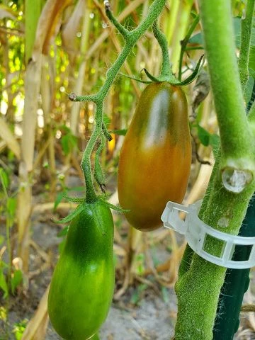 Aussehen: Die Schwarze Zapfen-Tomate hat eine charakteristische längliche, zapfenartige Form. Ihre Haut ist dunkelbraun bis schwarz gefärbt, oft mit grünen Streifen oder Flecken. Diese auffällige Farbe macht sie zu einem Blickfang im Garten oder auf dem Tisch.