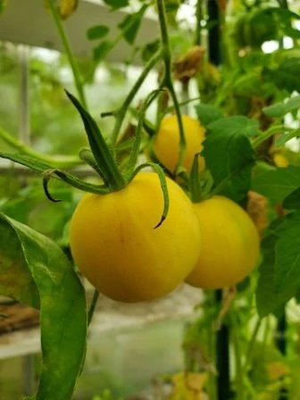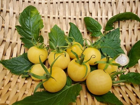 Aussehen: Die „Weißer Pfirsich“-Tomate hat eine blassgelbe bis cremefarbene Schale, die oft eine samtige Textur aufweist. Sie hat eine